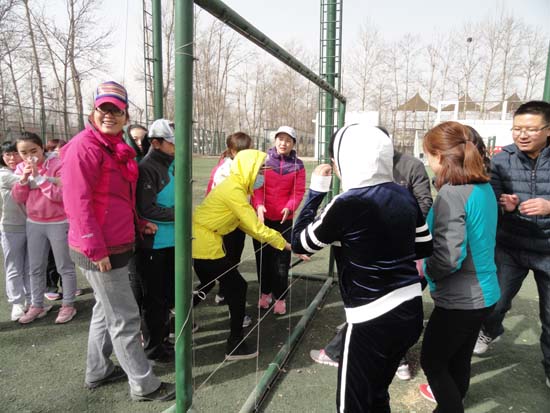 培訓當天,盡管天氣寒冷、黃沙漫天,但參訓隊員們個個精神抖擻,熱情高漲,訓練過程有條不紊進行?;顒娱_始時,進行了破冰熱身、團隊建設活動。全體隊員分為三組,在限定時間內分別組建各自的隊名、隊歌、隊徽及口號。隨后,隊員們信心十足,高呼著團隊口號,在專業培訓師的指導下開始了充滿挑戰的拓展項目。大家相互協作,互幫互助,順利完成了 “高空斷橋”、“穿越電網”、“千里傳珠”、“盲人方陣”、“搶度金沙江”等拓展內容。特別是在閉營項目“搶度金沙江”中,大家充分展示出團隊精神和挑戰困難的勇氣,使整個培訓活動達到了高潮。通過這些拓展項目,將挑戰自我,熔煉團隊,創造激情,強調奉獻,享受快樂的理念傳達給了每一位隊員。活動現場笑聲不斷,掌聲不斷,不僅使同志們感受到戶外運動的魅力,體會到溝通、協作的重要性,更引導大家以開放的心態面對變化,積極進取,啟發想象力與創造力,進一步提高了解決問題的能力,充分展現了水電女職工積極向上,團結進取的精神面貌。